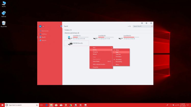 If you are pink person, then you’ll most certainly love the Proma skin. The visual style adds a heavy coral pink bar on the left side of the explorer window while letting classic white take over the rest of the background. There are touches of pink too on the devices and drives section which add up to the color scheme. The context menu, on the other hand, is completely shaded in pink, with white text therein still maintaining its legibility. Further the taskbar and background is given touch of red, which no doubt makes the interface more attractive and user-friendly.